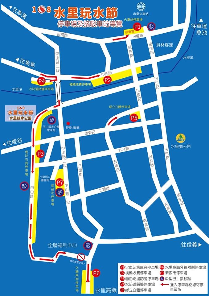 接駁車:水里火車站↔水里親水公園 (中途停靠:玉管處、新夜市停車場、水里國中站牌、員林客運),活動期間 (7/6~8/11) 每週六、日共12天停車資訊