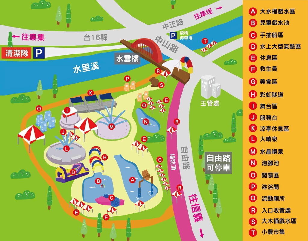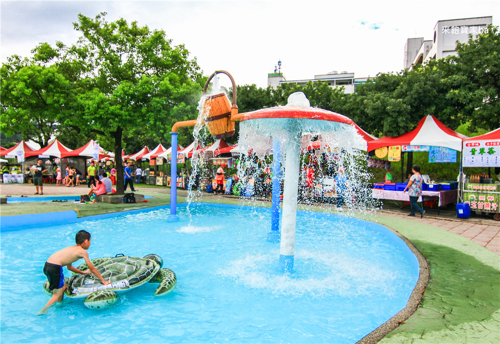 2019水里玩水節活動辦在水里親水公園,設施包含大水桶戲水區、兒童戲水區、大噴泉、水晶噴泉、泡腳池、水上大型充氣設施、手搖船區,小農市集則有攤販進駐
