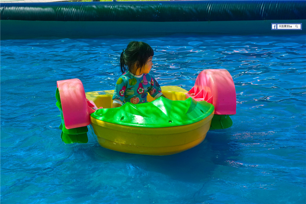 ▲ 手搖船,人多時限時3分鐘,可重新排隊再玩,若有幼兒家長可入池陪伴,像飽寶完全不懂怎麼手動搖船,全程就是靠工具人爸爸推到東又推到西,工作人員全程在水池裡留意孩子狀況
