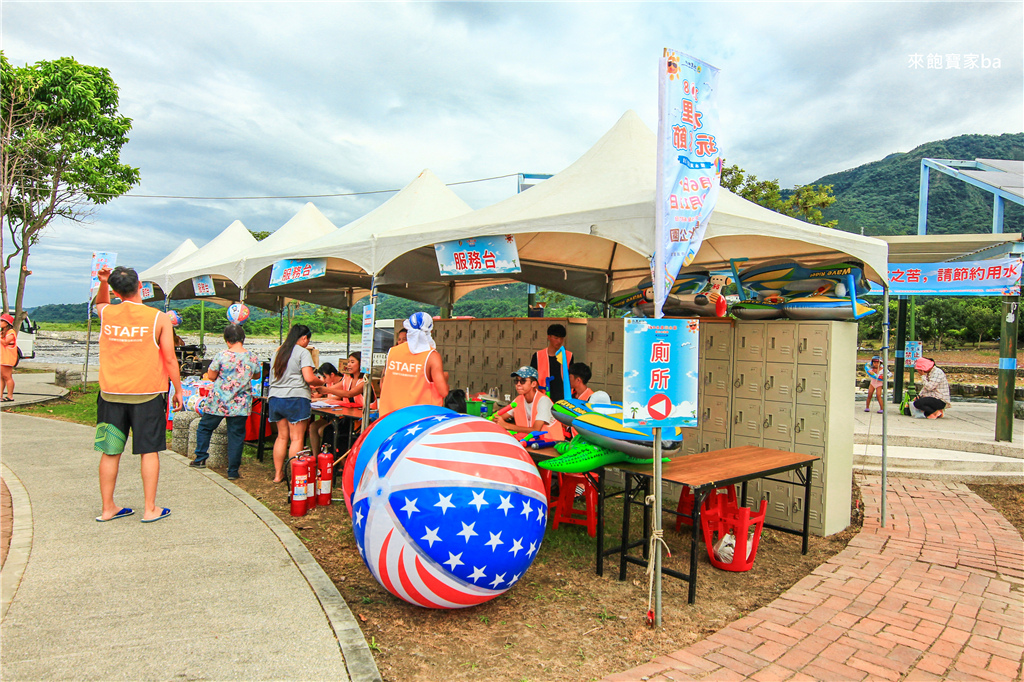 大型充氣玩具免費借用,一次限時30分鐘,抵押證件即可免費借用,可歸還後再換造型,有狗、鯨魚、魟魚、雙人船,108年水里玩水節玩水玩具更進化,水槍、大顆海灘球孩子們愛不釋手,為戲水增添樂趣,很棒的免費服務