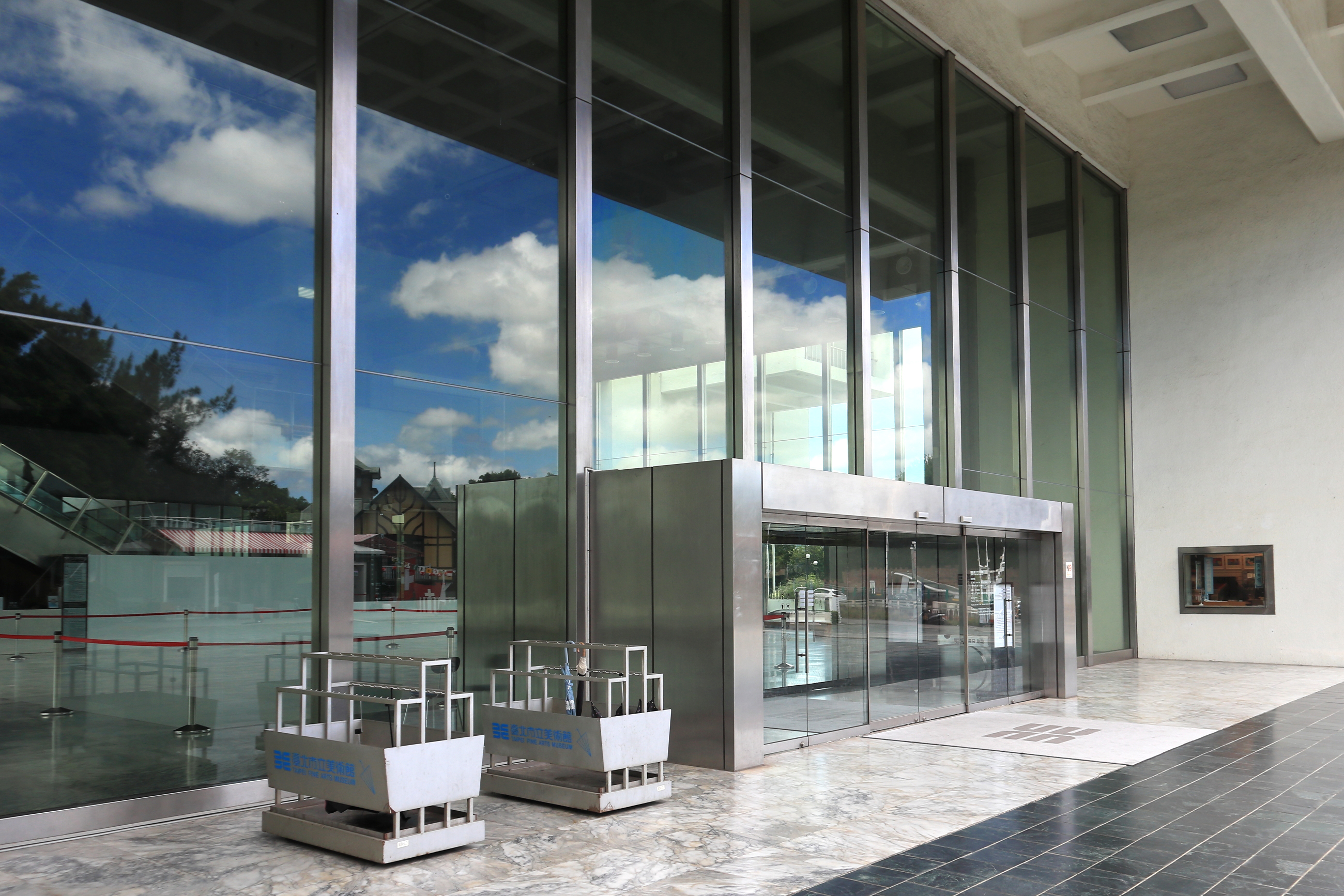 ▼美術館門口大片落地窗,倒映著藍天白雲的好天氣
