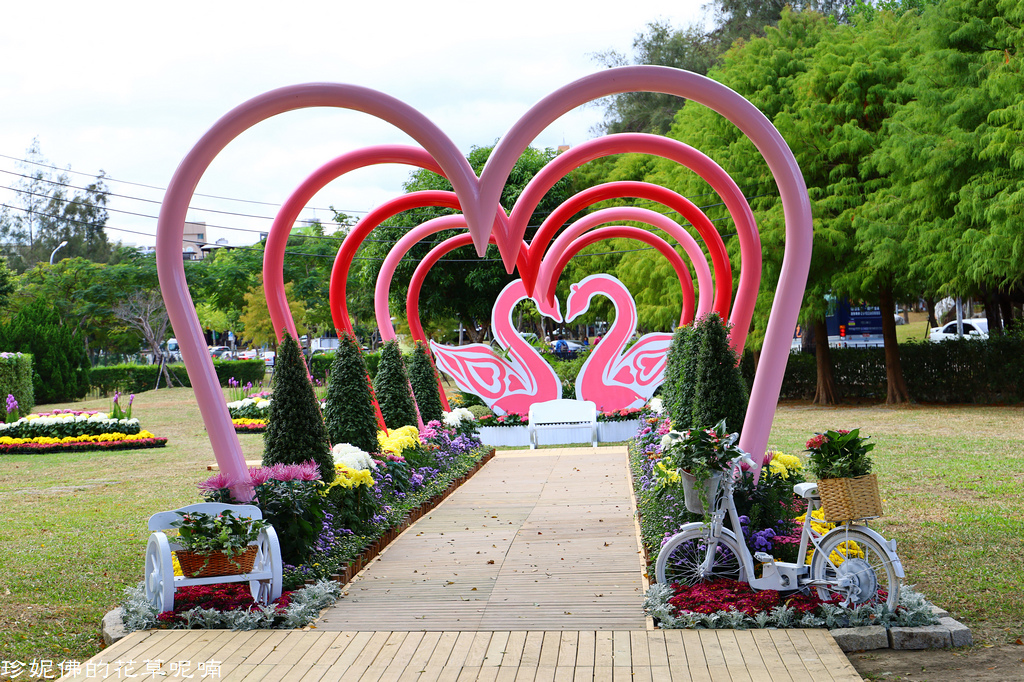 以綠雕雙天鵝組合愛的溫暖,匯集心心相戀的意象,並搭配愛心形狀造型菊