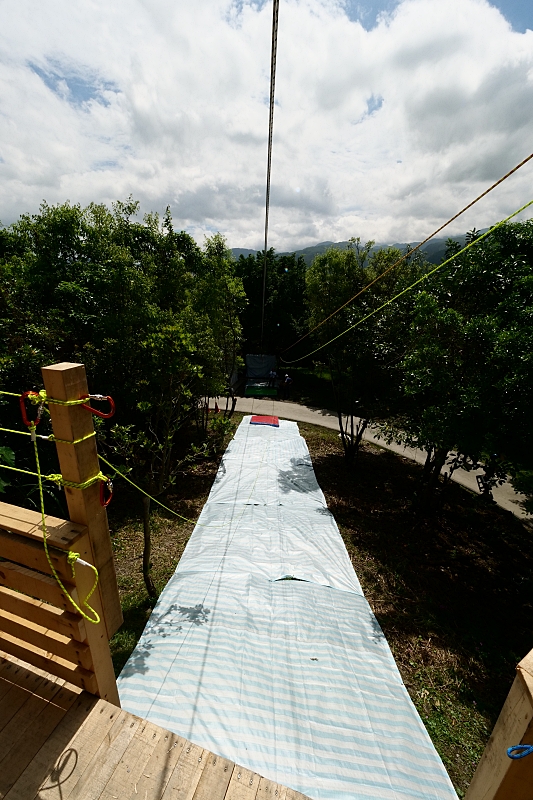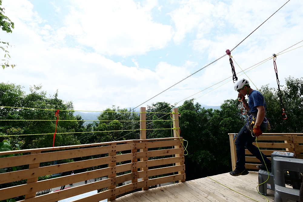 然後由專業人員綁好安全所,站上樓梯,然後喊 1 2 3 就往下滑。