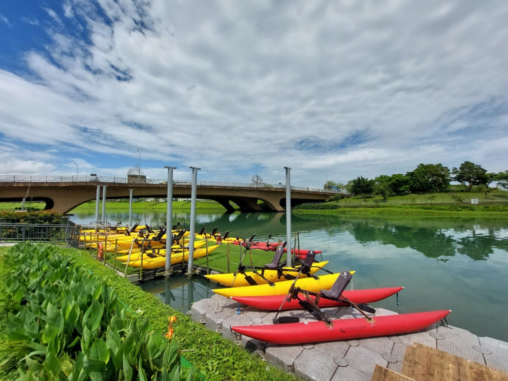 畫面中後方有個白色帳篷,就是「水上自行車與獨木舟」的出租處。