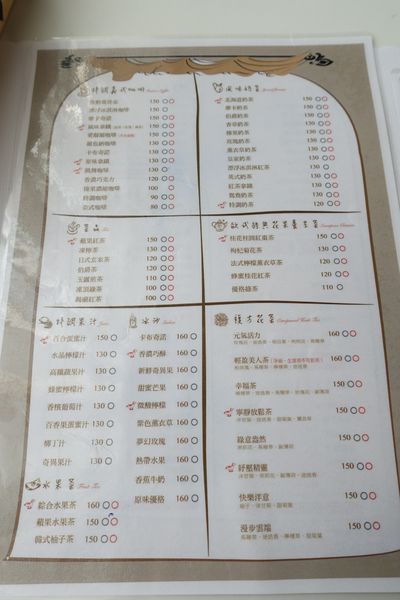 飲料則有水果茶、特調果汁、複方花茶、養生茶、咖啡等。