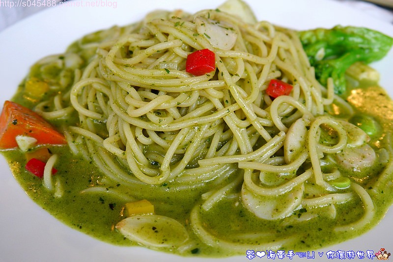 再來看看餐點部分,這天蓉蓉點的是青醬義大利麵,口感相當不錯好吃,青醬在口中濃而不膩~ ▼