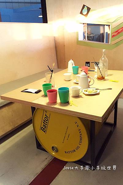 ▲鮮黃色油桶巧妙地變身成放置menu的邊桌