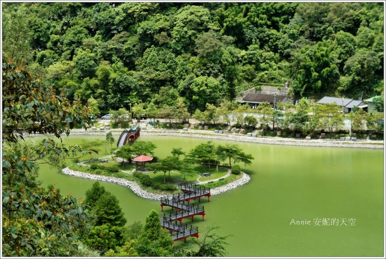 大約走了10分鐘的路程,抵達了飛龍步道的半山腰,這裡有個平台可以眺望整個這麼翠綠的湖,忍不住望龍埤和枕山村,湖面上有彎彎曲曲的小橋, 碧綠的湖水和蜿蜒的小橋,這景色真是太迷人了。