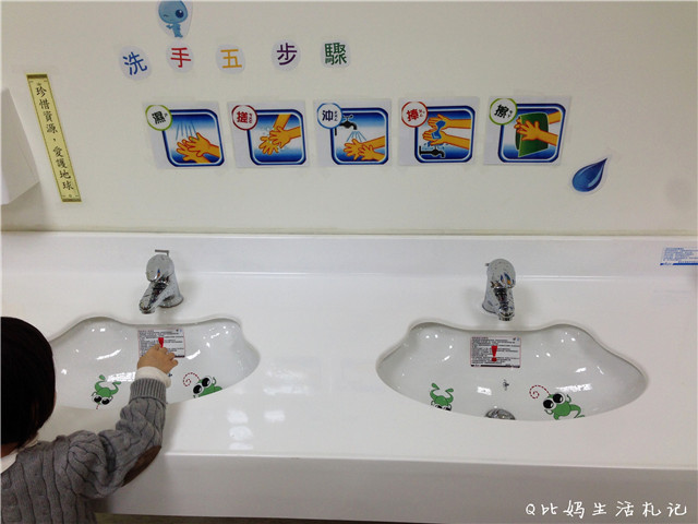 洗手台造型真可愛,是青蛙的外型,水槽裡還貼著青蛙吃蒼蠅的貼紙,