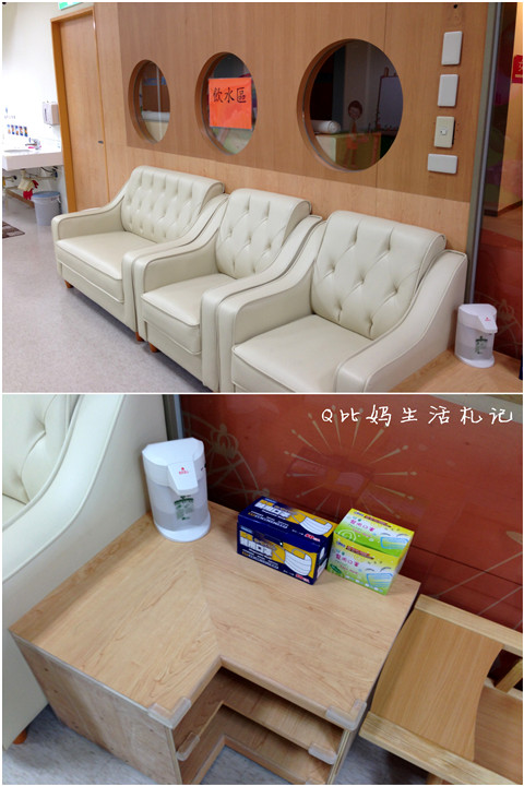 飲水區有舒適的沙發座椅,座椅旁的矮几上還備有大人及小孩的口罩和乾洗手,