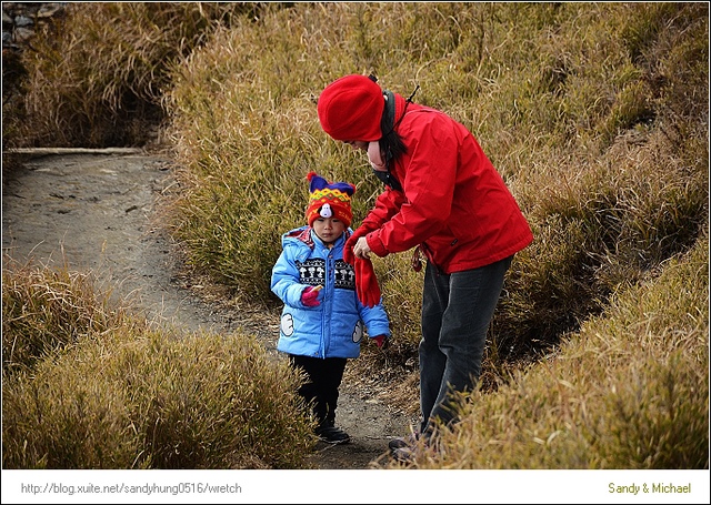 原本弟弟還可以走幾步路,但是風實在太強,弟弟怕風的聲音、加上高山空氣稀薄,我抱了弟弟也走不了幾步路,只好換由Michael抱弟弟,我陪著姐姐往上走。