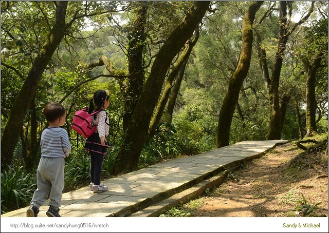 有別於觀音山的連續陡上(弟弟走沒幾步路,就要大人抱著),緩坡上升的仙跡岩 ,弟弟走來還算自如,途中遇上一對父子,孩子約略小學中年級,那父親跟孩子說:「你看!連人家小baby都自己走了,你還……(後段沒聽見)」,其實每每帶孩子爬山,總有山友看見兩小,不是為他們加油打氣,就是頻頻稱讚,不然就是說我們大人揹著好辛苦!帶兩小爬山不是想挑戰自己,也不是想怎麼訓練孩子,只是單純因為喜歡,把爬山當成很健康、而且很經濟的一種休閒活動而已!