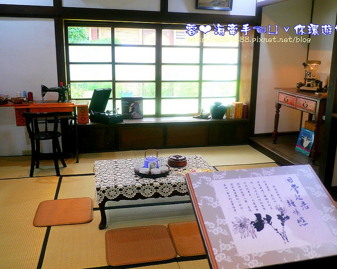 茶几、榻榻米地板、裁縫機、桌櫃、打字機、桌飾、燈飾..等等,整個空間都瀰漫著復古懷舊的氛圍