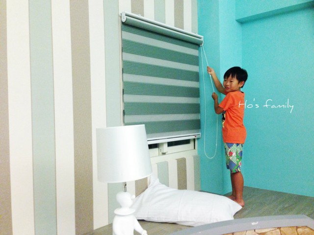 好奇的孩子連窗外視野都想一探究竟,拉起窗簾還一邊唱升旗歌,媽媽忍不住跟著立正站好了(歪腰)