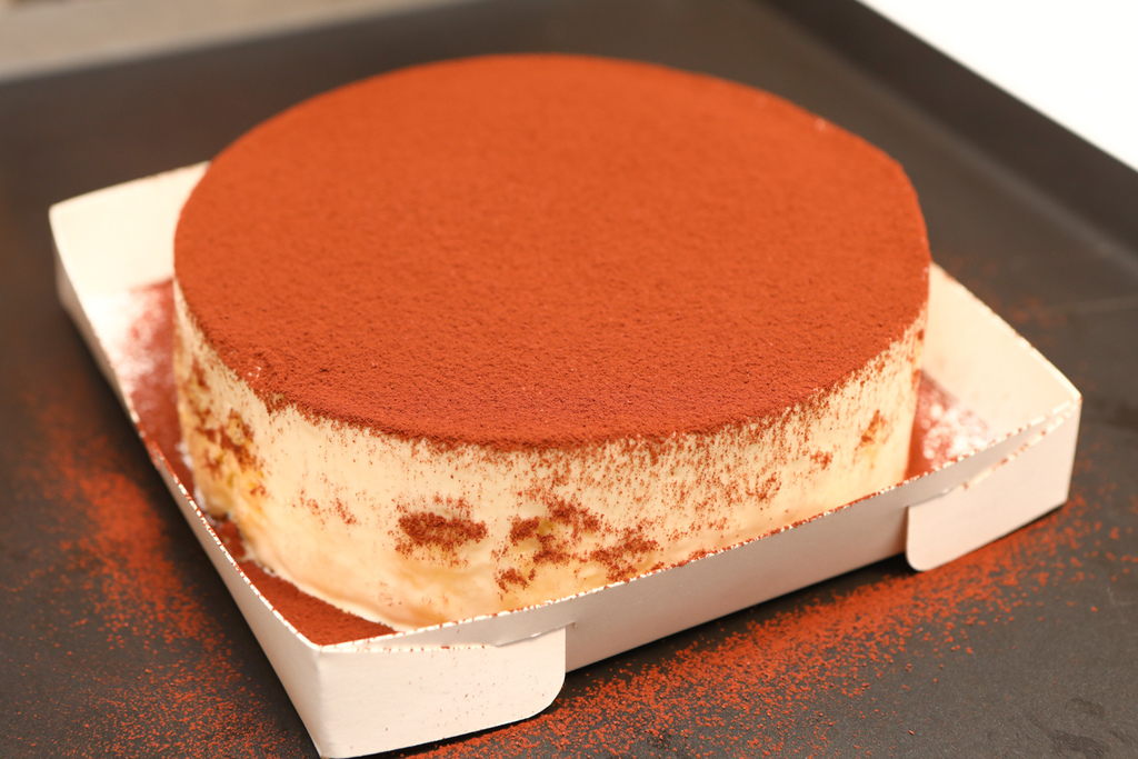 倒入一層馬斯卡彭起司、蛋黃、糖的慕斯,然後再在蛋糕表面灑上一層可可粉而成!