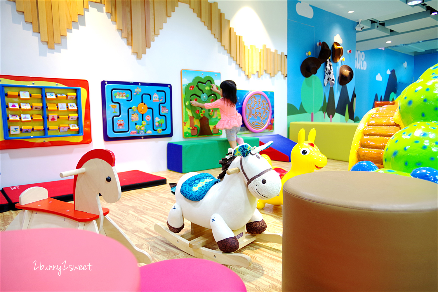 大積木、搖搖馬、跳跳馬,牆面上還有很多適合小娃兒的動動手玩具。