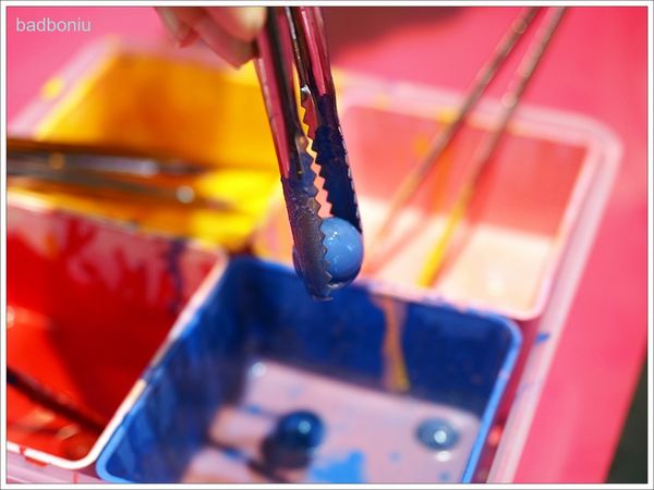 每一桌的桌上都擺有四色的水彩,裡面有好多大小不一的彈珠,等一下就是要利用這些彈珠來作畫喔~