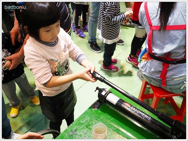 裝好之後就排隊去前面將色膏壓成蠟筆。這邊可以讓小朋友自己操作壓桿,小朋友都好愛;只可惜因為後面排隊的人真的很長,所以最後只能大人來做會比較快速。