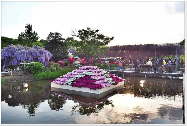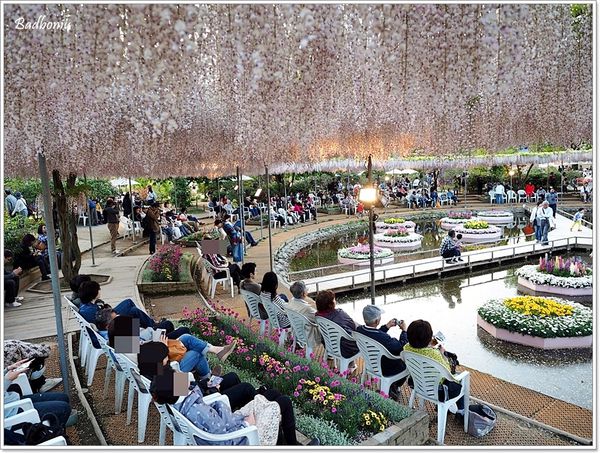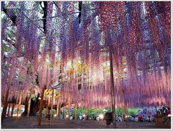 兩棵大藤中間串連起的紫藤隧道,真的是好夢幻!但是因為咱們家真的沒有構圖的天份,現場看真的比照片上還要漂亮100倍呢(無誤)!我們大約7點鐘,天色剛全暗的時候離開,看到外面買票的人潮,想著還好我先進去了! 不然現有園區內的人再加上正在排隊買票的人,一起擠進去的時候,大概會寸步難行了吧! 所以勸大家不要為了省一點點錢,這樣子的景色,每一分鐘比門票錢珍貴!