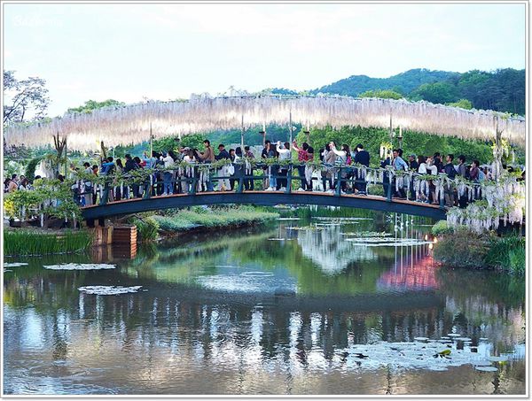 大藤區的旁邊還有一座通往旁邊小島的橋,橋上也開滿了紅藤唷!