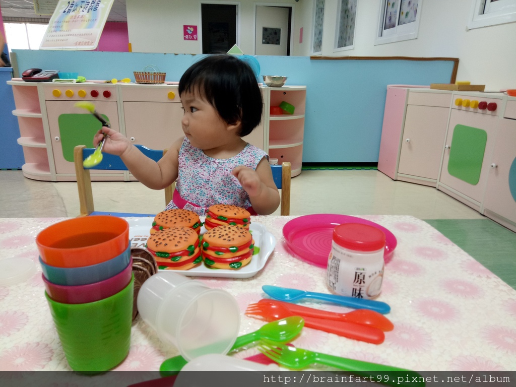 沒有知名品牌廚具組加持,善用櫃子讓娃娃角色扮演區的範圍加大,更多孩子可以一起同樂,主題會稍微更改,之前類似早餐(漢堡、優格),近期變化成中式炒麵,提供縮小比例鍋碗瓢盆,及創意仿真食材,利用毛線當麵線等