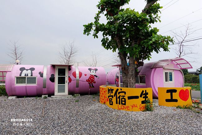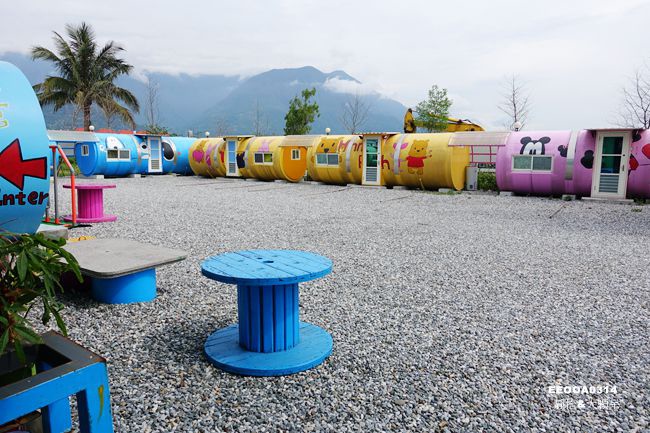 一字排開的彩色水管屋搭配著各種卡通塗鴉好吸睛,這裡是悠涼水管屋二館,距離一館開車約3分鐘左右,check in時必須先到一館或是到達前先連絡民宿主人再前往二館
