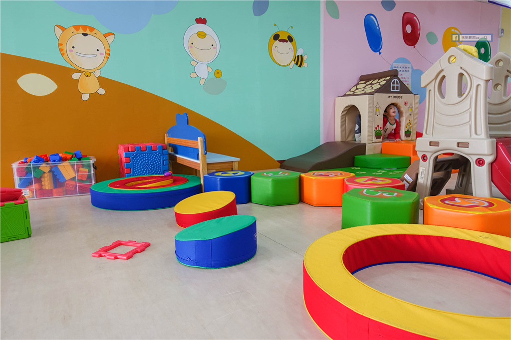這階段的孩子不是爬行兒就是學步兒,育兒資源中心特地為他們規劃保障區,獨立空間不受大孩子打擾,軟墊保護遊戲安全,教具則有健力架、軟球、布書等