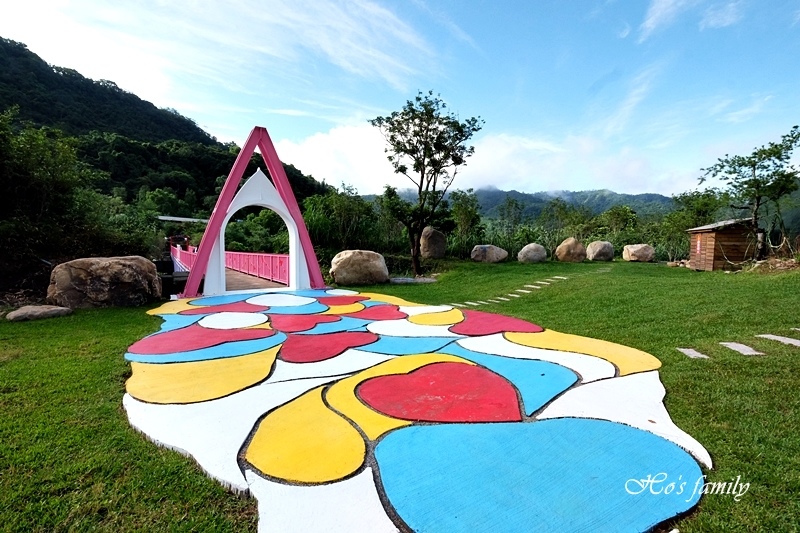 剛到目的地時令人眼睛為之一亮,水岸松林農場露營區有個好美的ig打卡點,粉色拱門吊橋前,草地上有著繽紛的愛心圖樣,在山中一片綠意中顯得相當亮眼,無論是情侶或是家人來拍照都是最佳取景點。