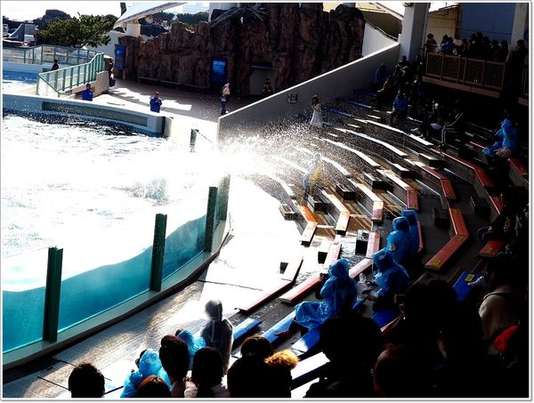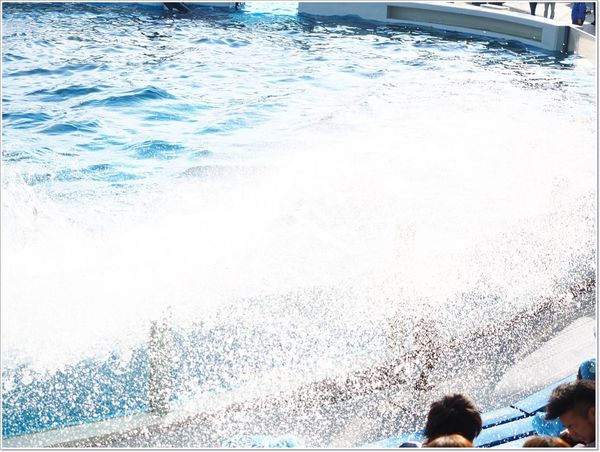 殺人鯨體型很大,一跳起來濺起的水花也超大,還會表演「深水炸彈」,視覺跟聽覺效果很震撼