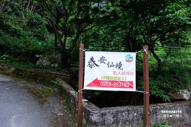 前往【泰安仙境】可以將導航設定“清安國小”,若是設定【泰安仙境】會帶到別處喔,抵達“清安國小”後延途一旁的電線桿都有指標,跟著走就會來到這【泰安仙境私人招待所】的白色帆布處,這裡為交叉路口,要往左邊開,往上開還有一段不短的山路,所以【泰安仙境】真的位在仙境呀,海拔974,地處高勢~