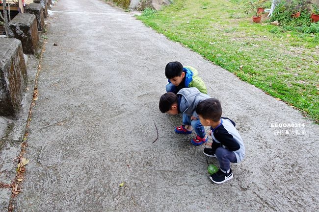 親子露營最大的樂趣便是孩子可以結交新朋友,不知不覺就玩在一起了,這三個一起在抓昆蟲,然後那長長一條可別以為是繩子了,牠是蚯蚓,小捧油膽子大,馬麻我是年紀越大膽子越小呀!