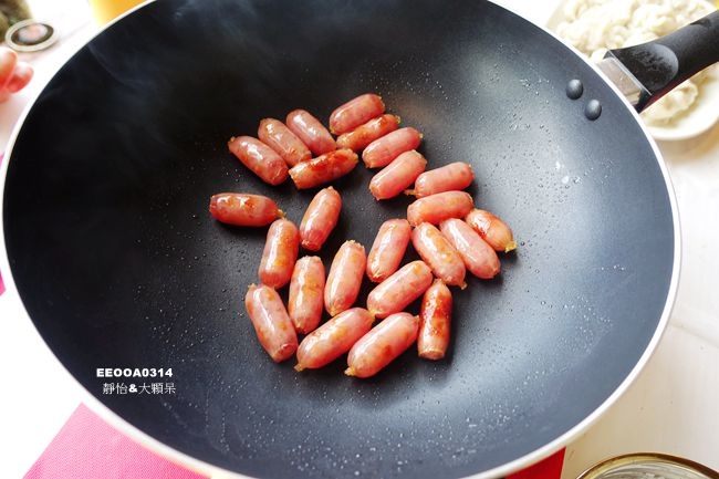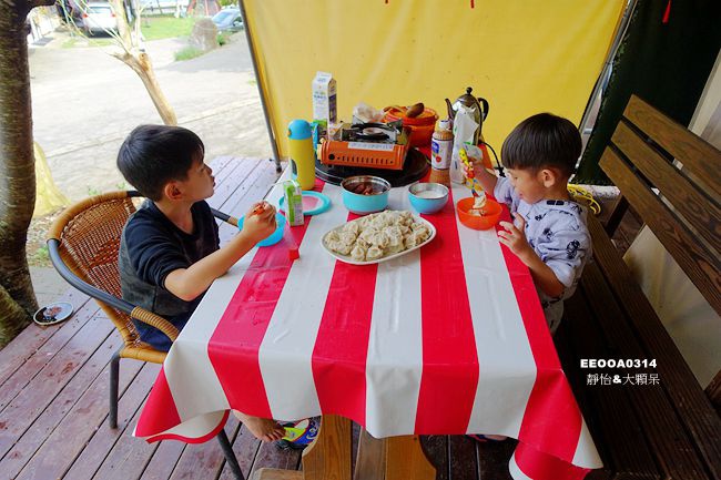 這天早上我們吃的是水餃跟小香腸,前一晚採買食材時問兒子早餐要不要吃蛋餅,兒子說要吃水餃,就買了一大包回露營區冷凍,這樣一大包水餃兩大兩小吃起來綽綽有餘