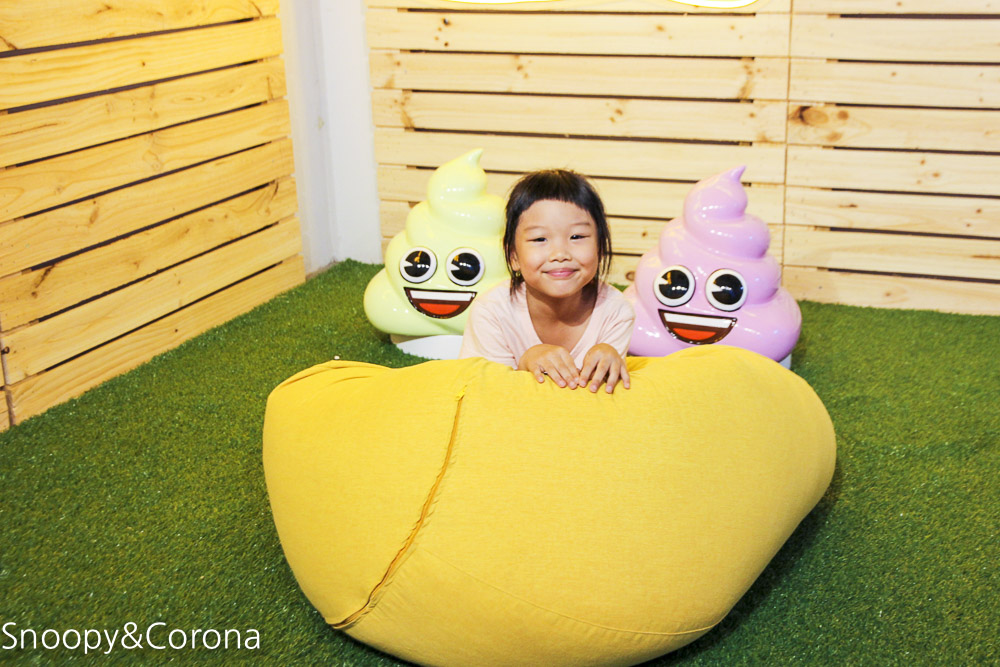 小小的草地上有懶骨頭坐墊和兩坨便便公仔,