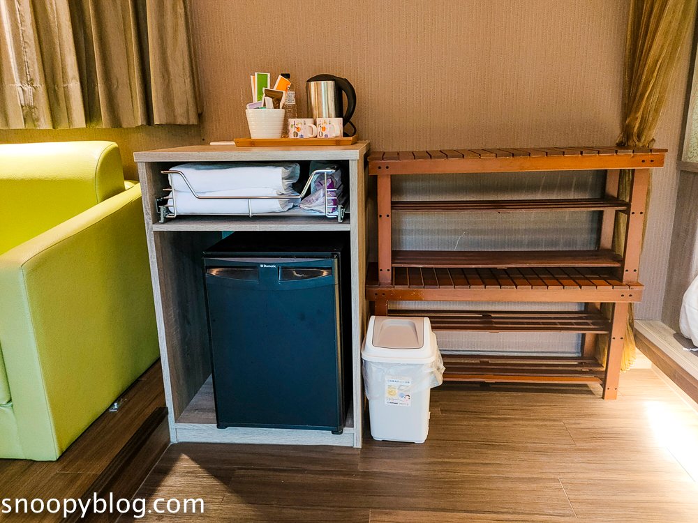 迷你吧檯上備有馬克杯、熱水壺、備品、毛巾、吹風機,