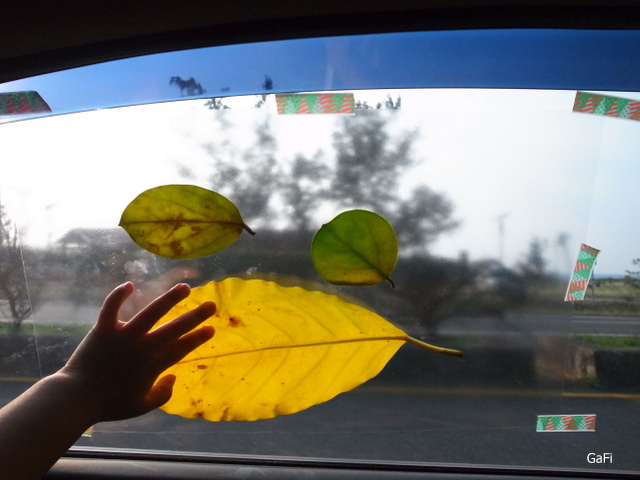 回程路上,阿鼓將其他蒐集來的樹葉拿來當創作素材~