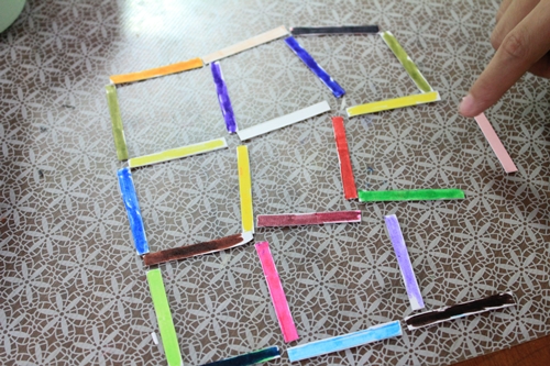▼拿出3根彩虹棒,變成5個小正方形。