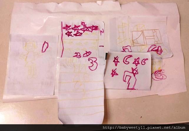 我先問Bunny, “What did you do yesterday?” 讓她回憶昨天做了那些事,特地選在週日做這一項作業,是因為週六整天陪伴孩子,並且陪孩子出去玩,比較容易讓孩子的印象深刻,我也比較容易和她一起討論。請Bunny把昨天做過的重要的事畫在小紙上(以A4紙張裁成一半)。