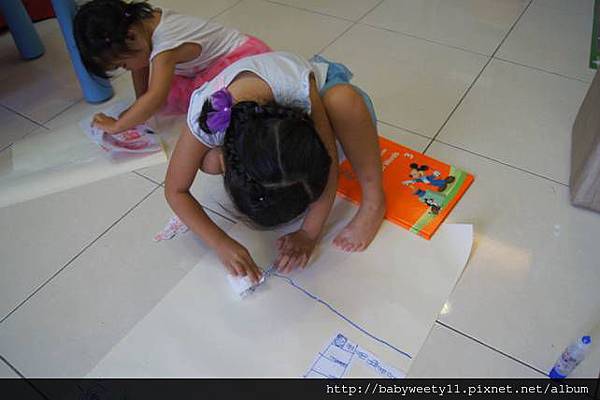緊接著,就取一張大張的紙,為了方便孩子寫字、發揮想像力,我特地使用IKEA的畫紙,裁了長長的一張紙,這時讓Bunny練習依昨天的時間順序,把每件事依序排列在大張紙上。排錯了,別急著糾正,讓孩子全部排好,再請她看一下圖片。
