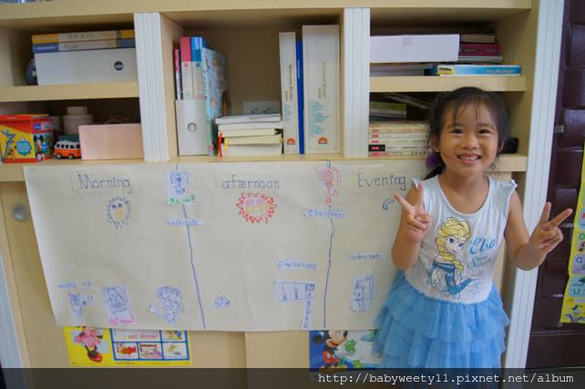 請Bunny把所有的圖片和文字都貼到紙上,午餐和晚餐是貼在線上,因為很多人用餐的時間會跨越區間。此時,已經有明顯的區間了,這才介紹 “Morning, Afternoon 及 Evening” 這3個字,為了突顯這3個單字,我準備了較大的格線紙讓Bunny寫,還是請她從海報上找出這3個字來抄寫。