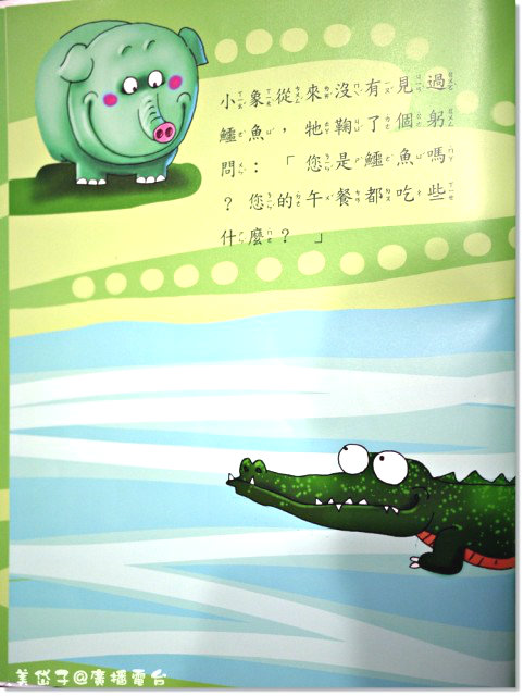 從此小象的親朋好友、叔叔伯伯通通去找鱷魚報到,通通問了相同的問題~鱷魚午餐吃些什麼?