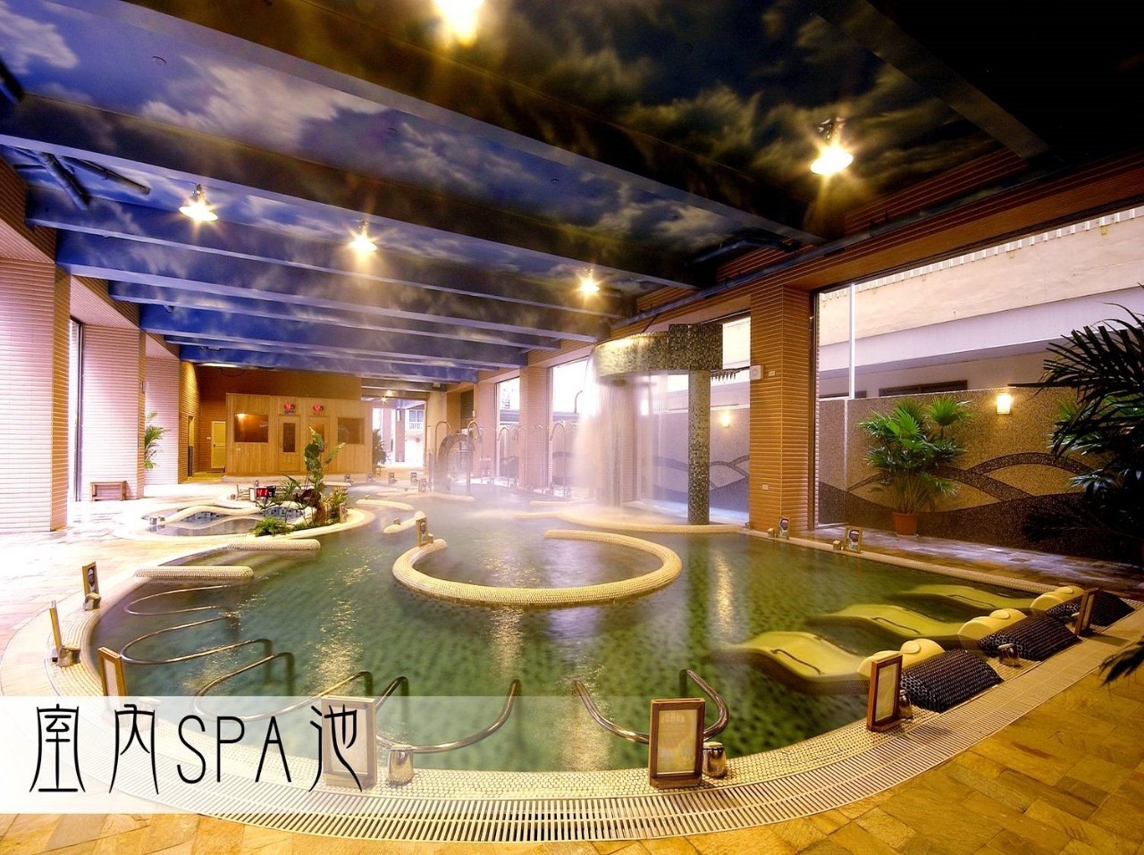 溫泉SPA區,包含浮浴按摩泉/穴道沖擊/全身穴道按摩/逆泳按摩浪/氣泡湧泉池/牛奶浴等。