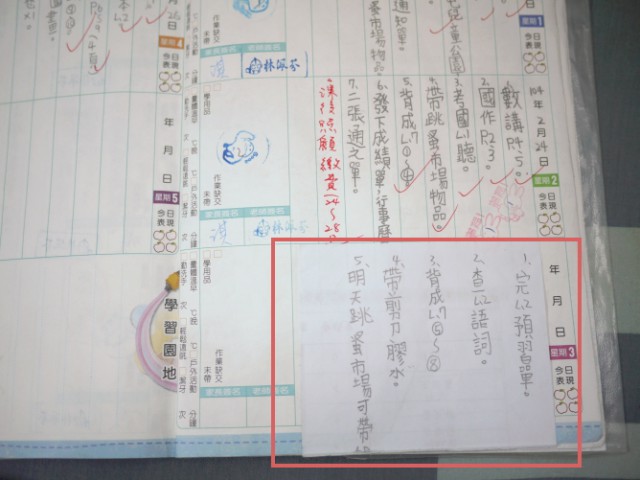在備忘錄的首頁上,家長可以和孩子一起確定備忘項目包括上課必帶書和各種文具等,