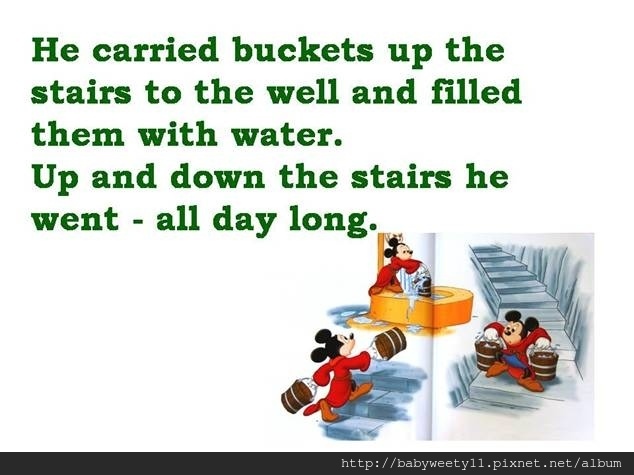 這是個很久、很久以前的故事,說到了米奇的工作有掃地、擦牆壁、砍柴、搬書,還要帶著水桶去井旁提水,一整天忙碌,都沒有時間玩。