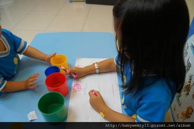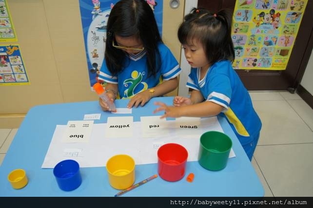 Bunny和Sweety最期待的部分就是「測量」(Measure), 我不是讓她們自由的玩水,而是讓她們用最小的黃色杯子裝水,倒入各個顏色的杯字中,Bunny主動為妹妹示範如何裝水、倒水後,就讓妹妹先裝水、倒水,Bunny負責數倒入幾杯水。兩個不同年紀的孩子開始分工了,Bunny也很樂意讓妹妹先倒水。每裝滿1 個顏色的杯子,就把杯數紀錄在表上測量值的欄位。