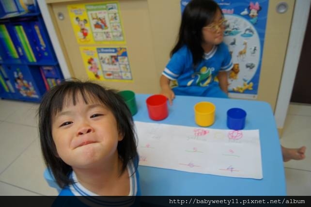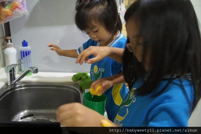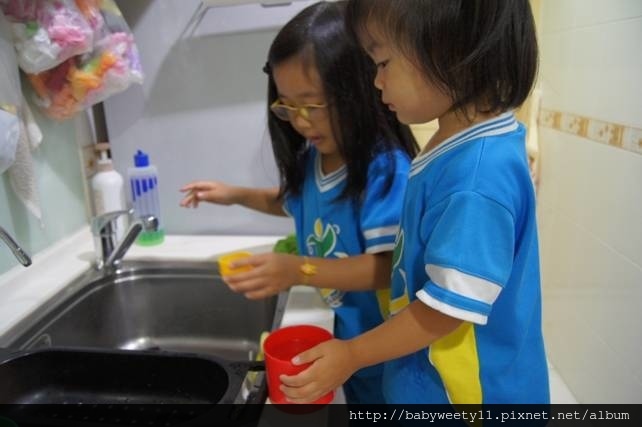 換了一個顏色的杯子,姊妹倆就交換角色,由Bunny來裝水、倒水,Sweety負責數杯數。其實Sweety還沒有精確的「量」的概念,一定要幫忙她數著,不然就會很快數到10了。