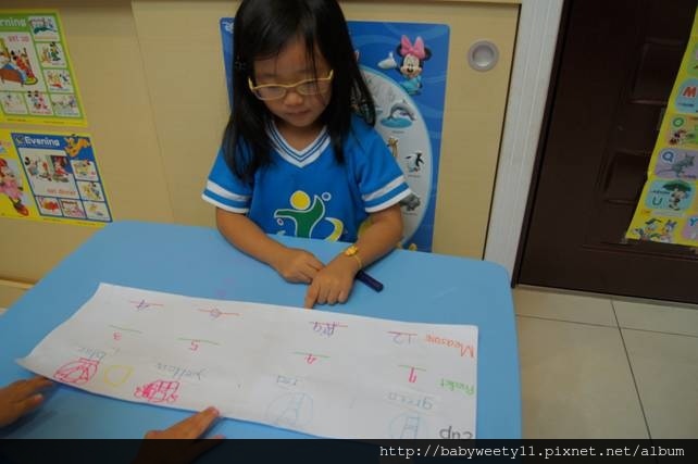 單字抄寫好後,再把杯子和字卡排序一次。對於這位美語學習新手,加上還有一個2歲娃在一旁搶著動手時,這個步驟可以避免孩子貼錯單字。
