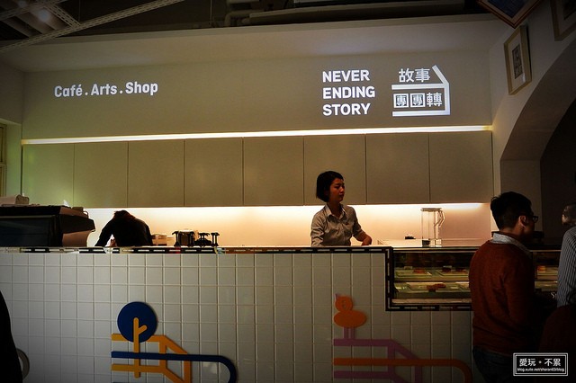 外觀看不出有任何誰的影子,大大的牌子上寫著Cafe.Arts.Shop,這是一家複合式的商品吧!高高掛的招牌寫著故事團團轉,如果有follow幾米的人,才會知道這是一本幾米的書,內容寫著2008年以來幾米作品的製作幕後故事。(我是沒有啦!)