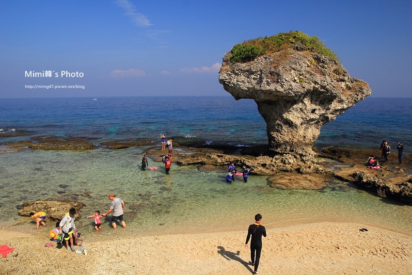 離商店街不遠的海岸邊,一朵大香菇就佇立在這裡,她是最讓人熟悉的小琉球景點「花瓶岩」,天氣頗熱,12月雖是北半球的冬季,這裡卻彷彿感受不到似的。