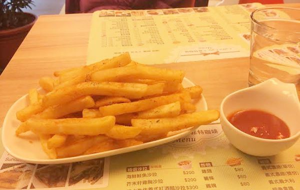 我們點一份薯條+熱拿鐵 (Toal 180元),拿鐵香淳順口、不苦澀,附上可愛小熊拉花。