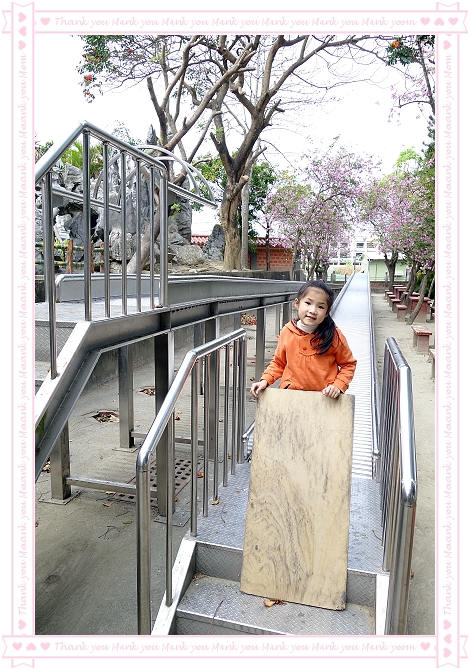 佳福寺管理委員會還給這座溜滑梯一個名號,叫做"小朋友最喜愛的滾輪滑臺",而且初春還伴有羊蹄甲的花映襯著滾輪溜滑梯.
